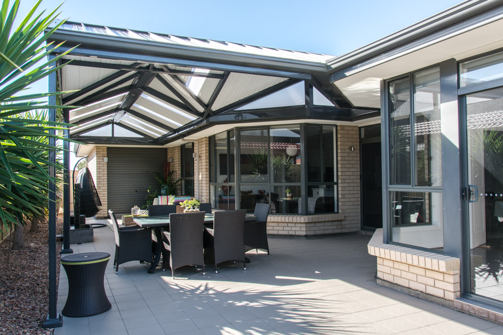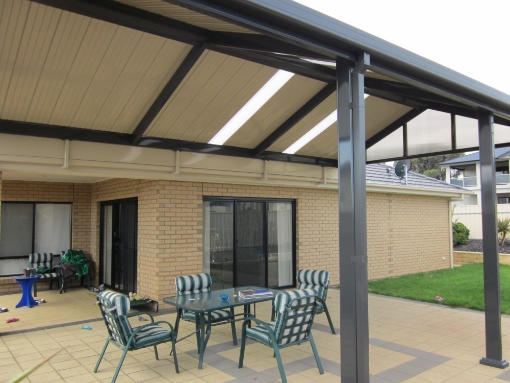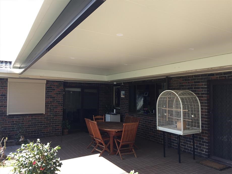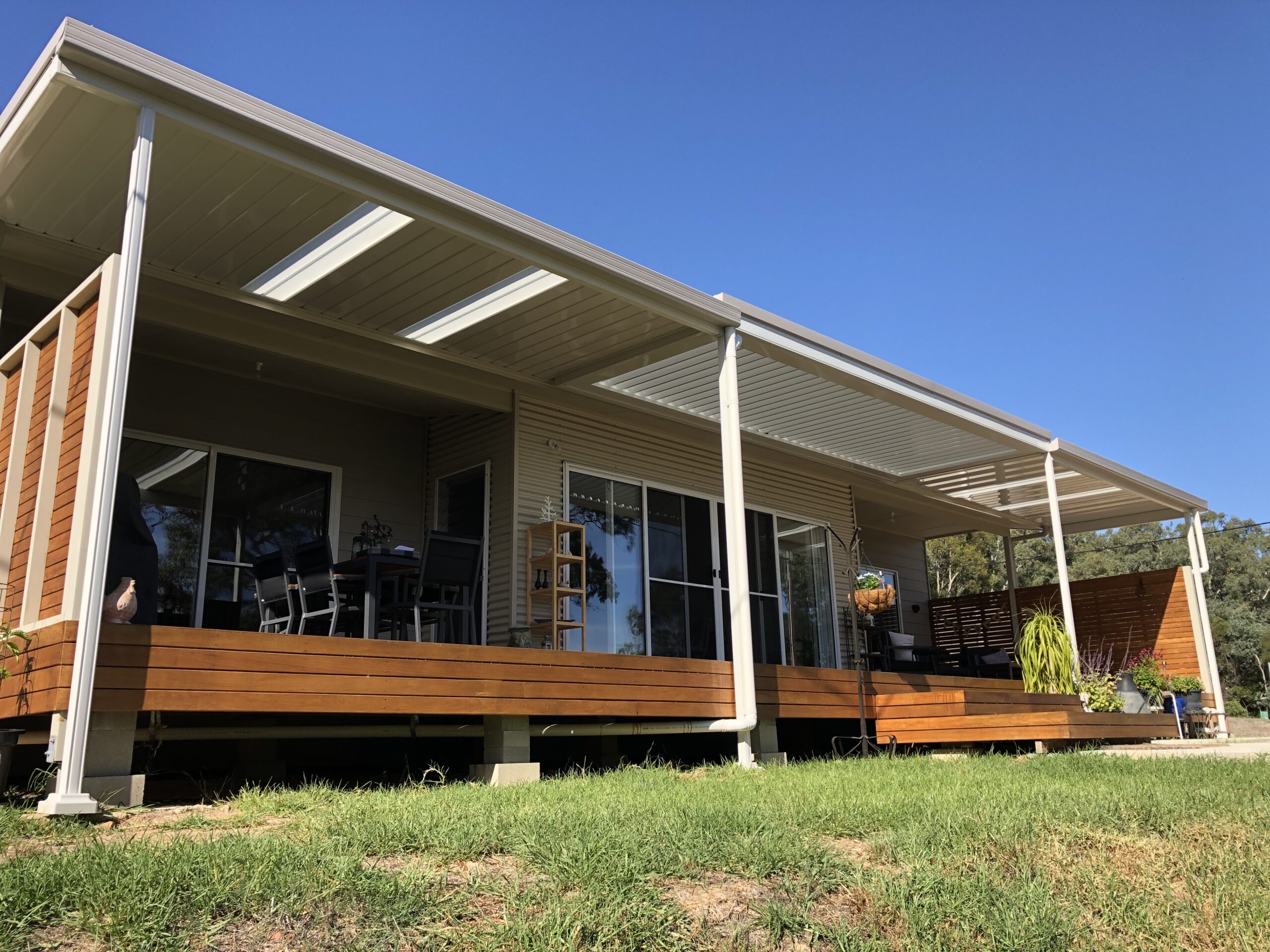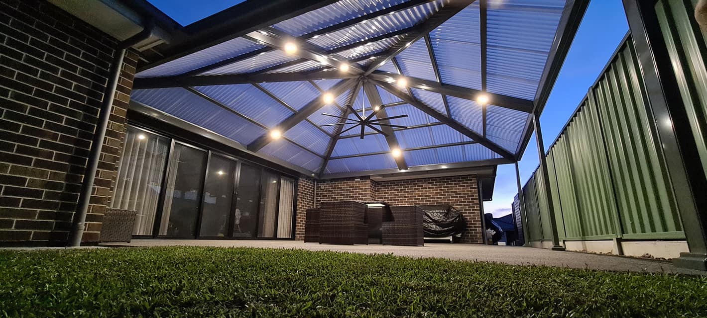 This beautifully designed Colorbond verandah showcases a modern outdoor space with fibreglass roofing, perfect for enhancing any home. A great example of home improvements by expert builders, providing a durable and stylish patio area.