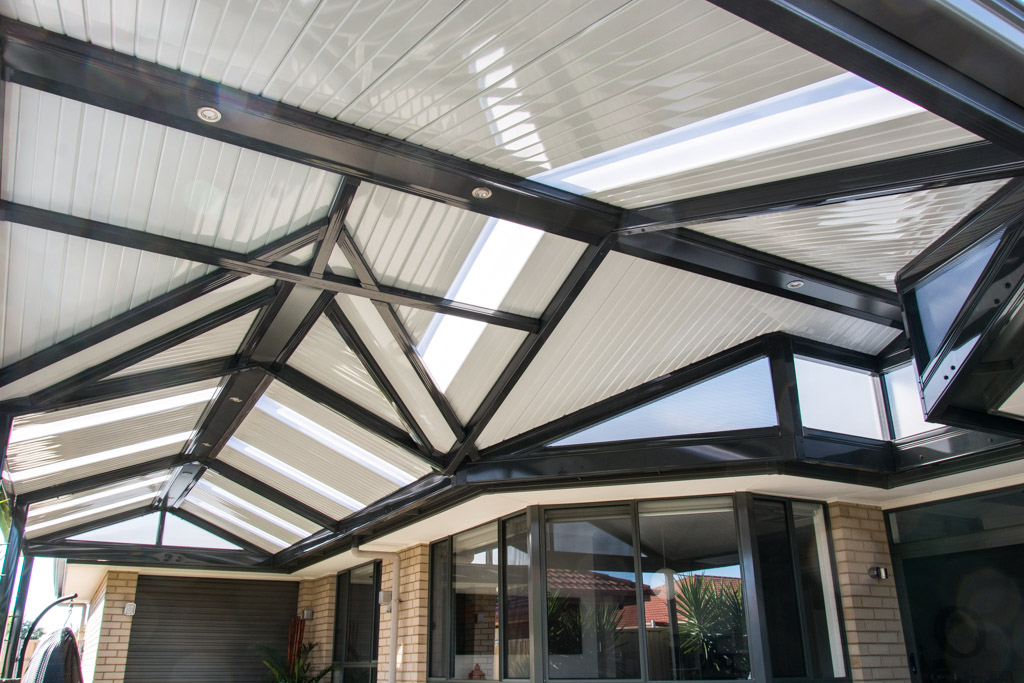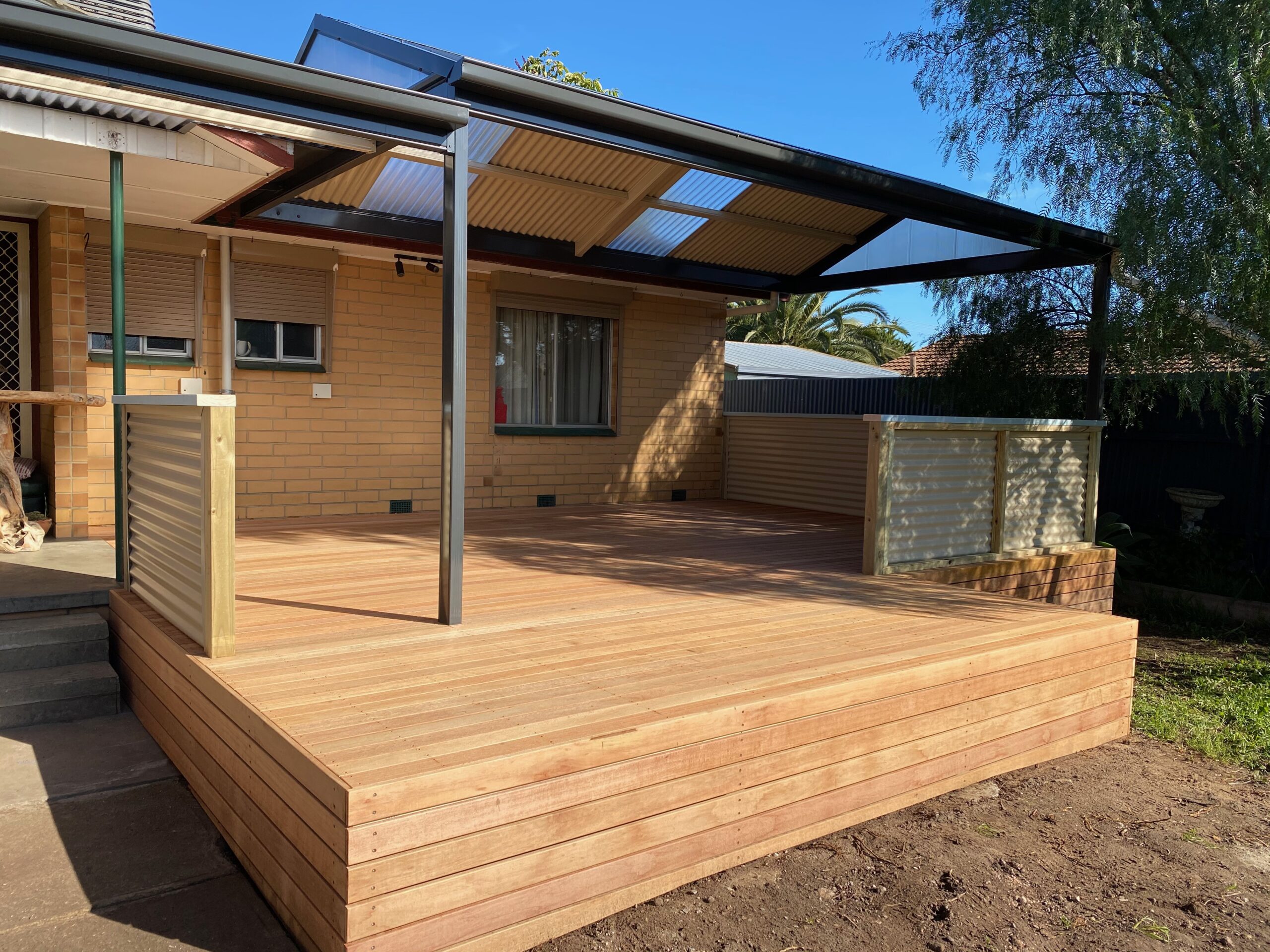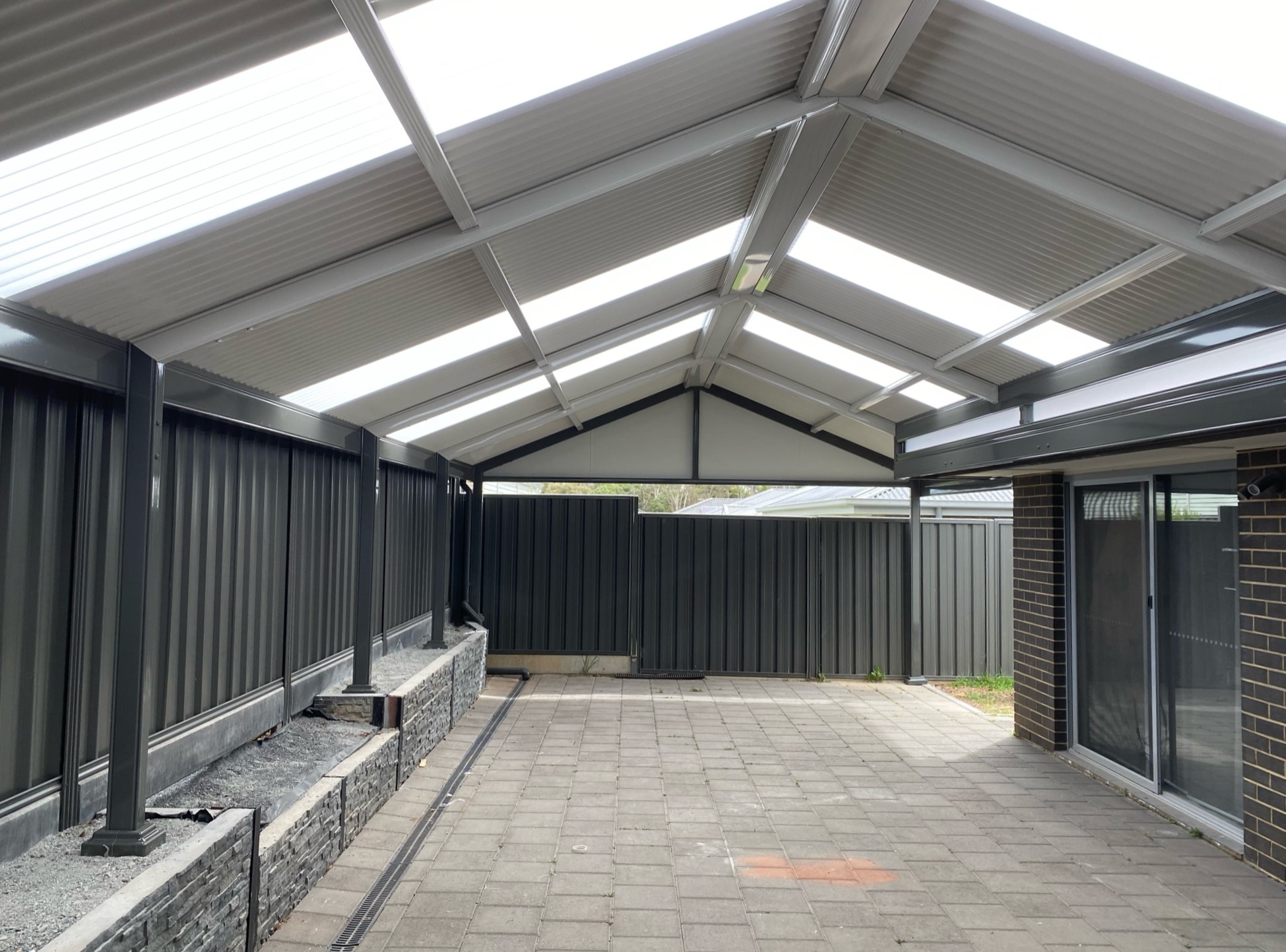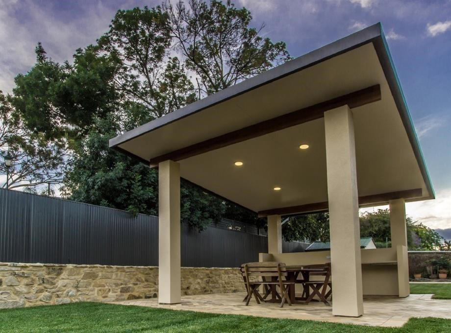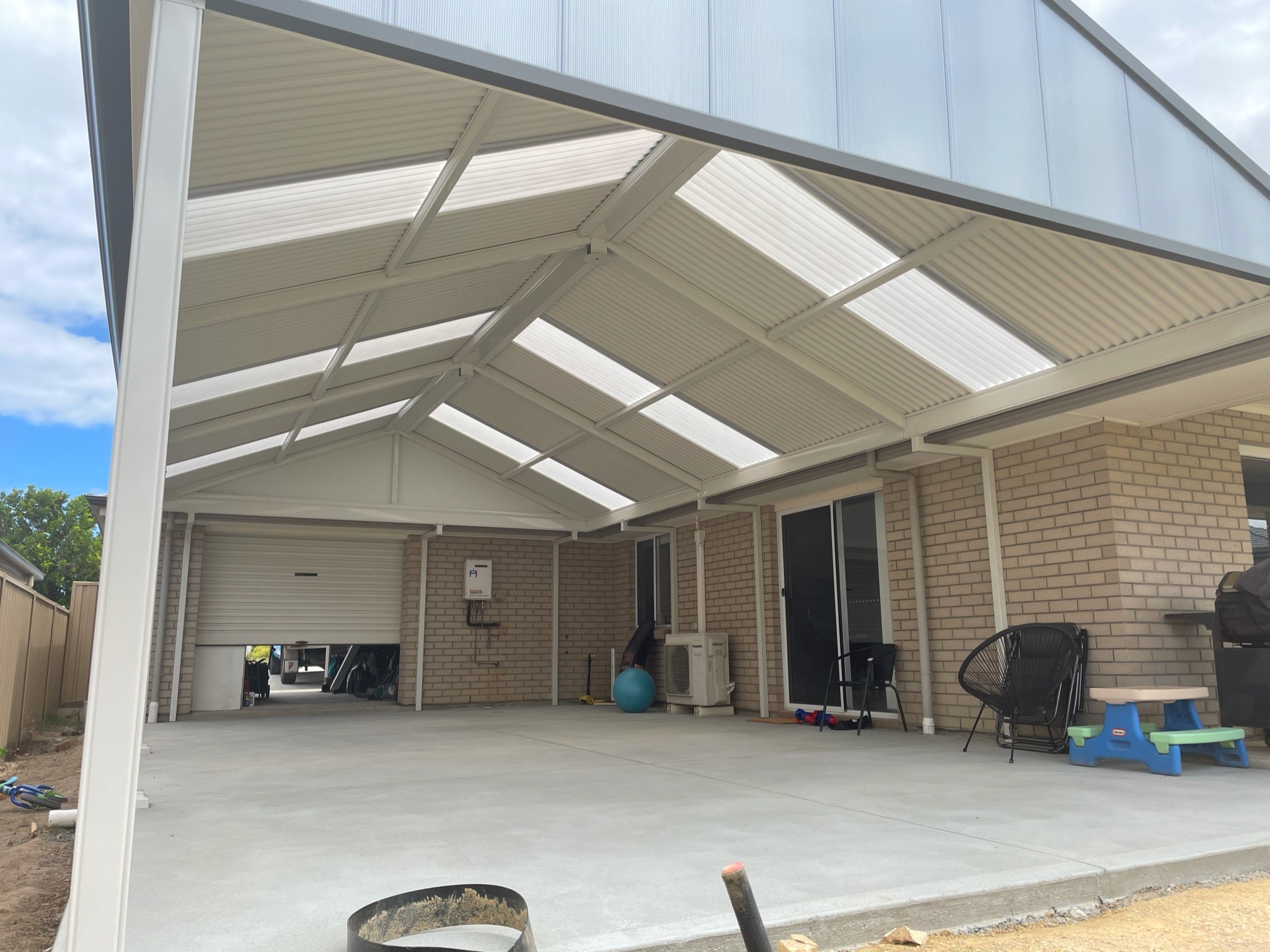 This beautifully designed Colorbond verandah showcases a modern outdoor space with fibreglass roofing, perfect for enhancing any home. A great example of home improvements by expert builders, providing a durable and stylish patio area.