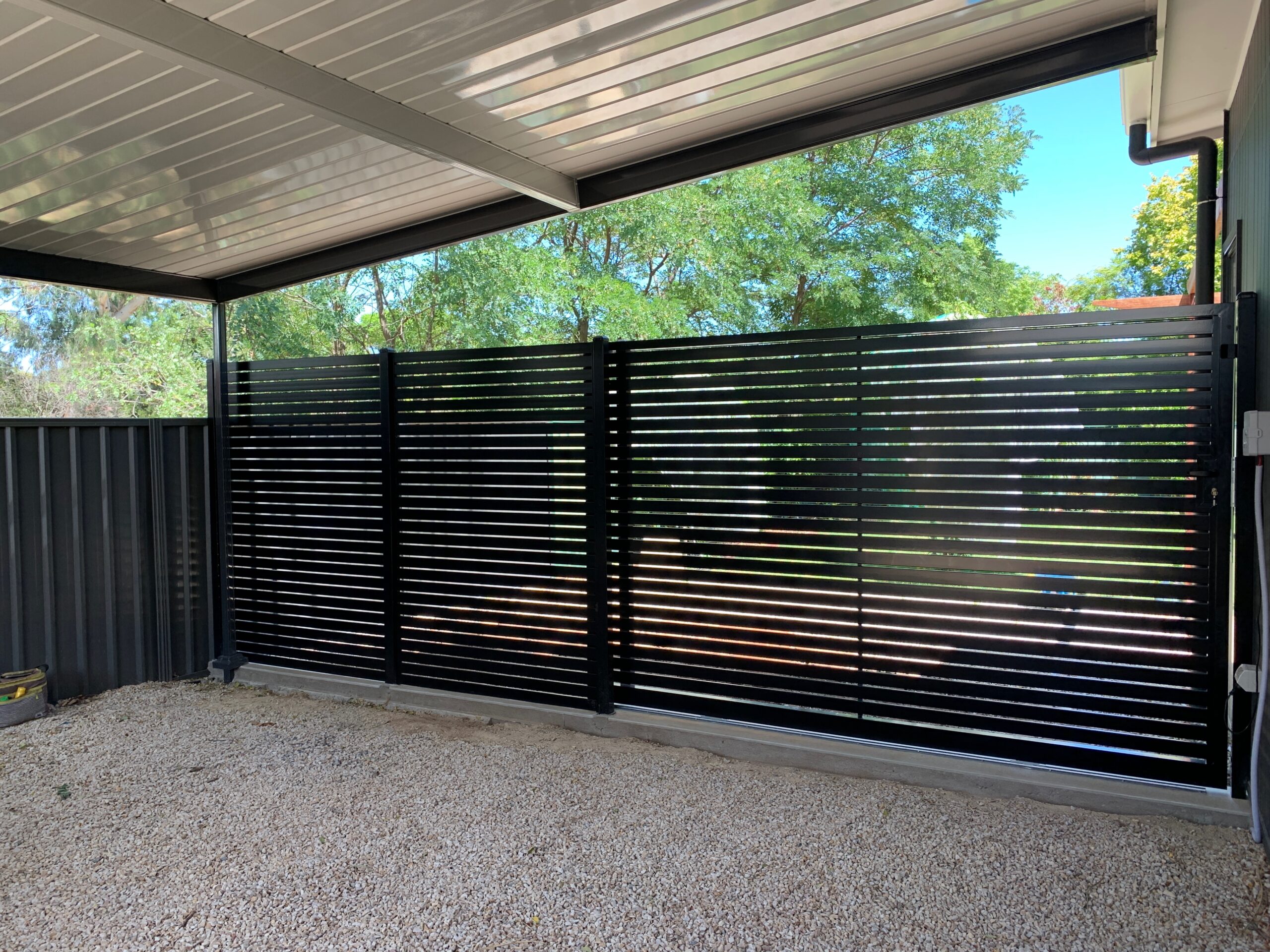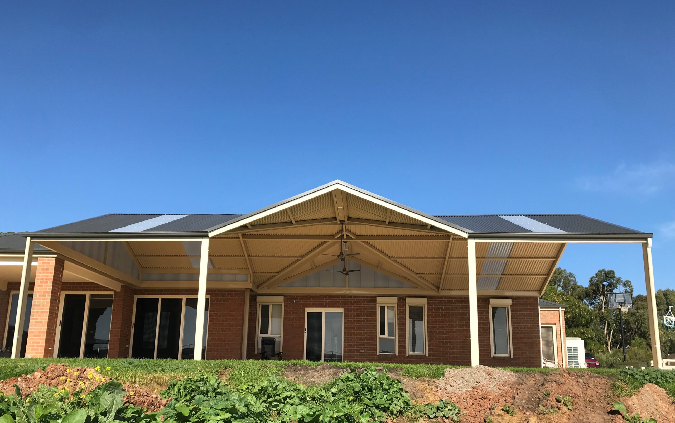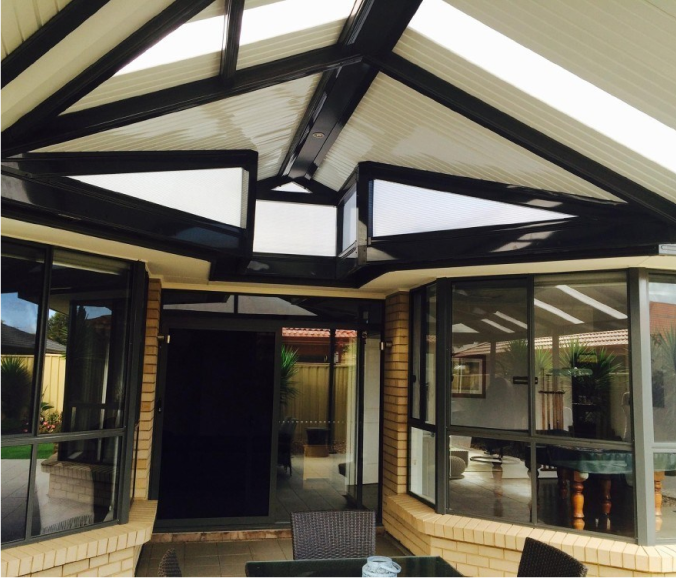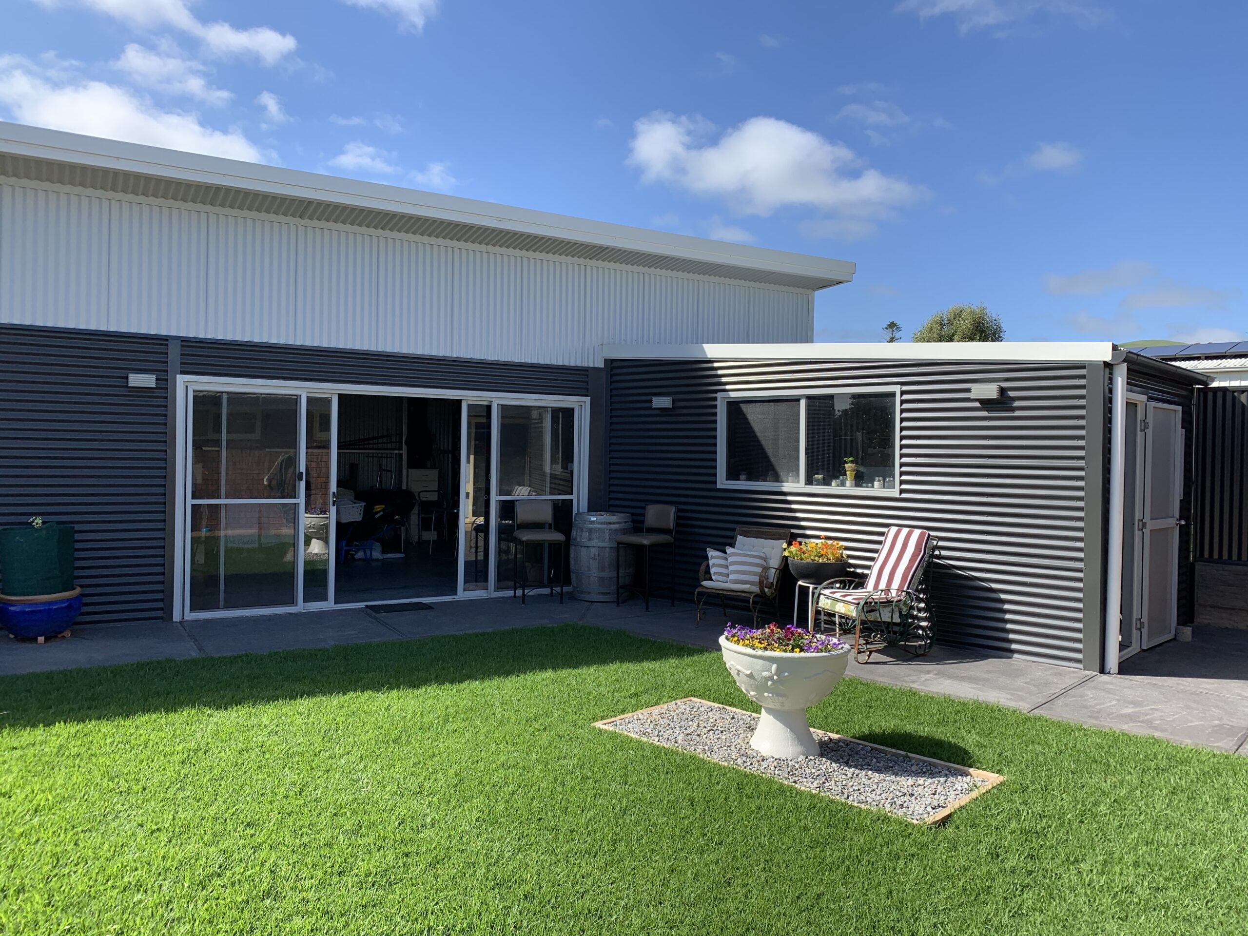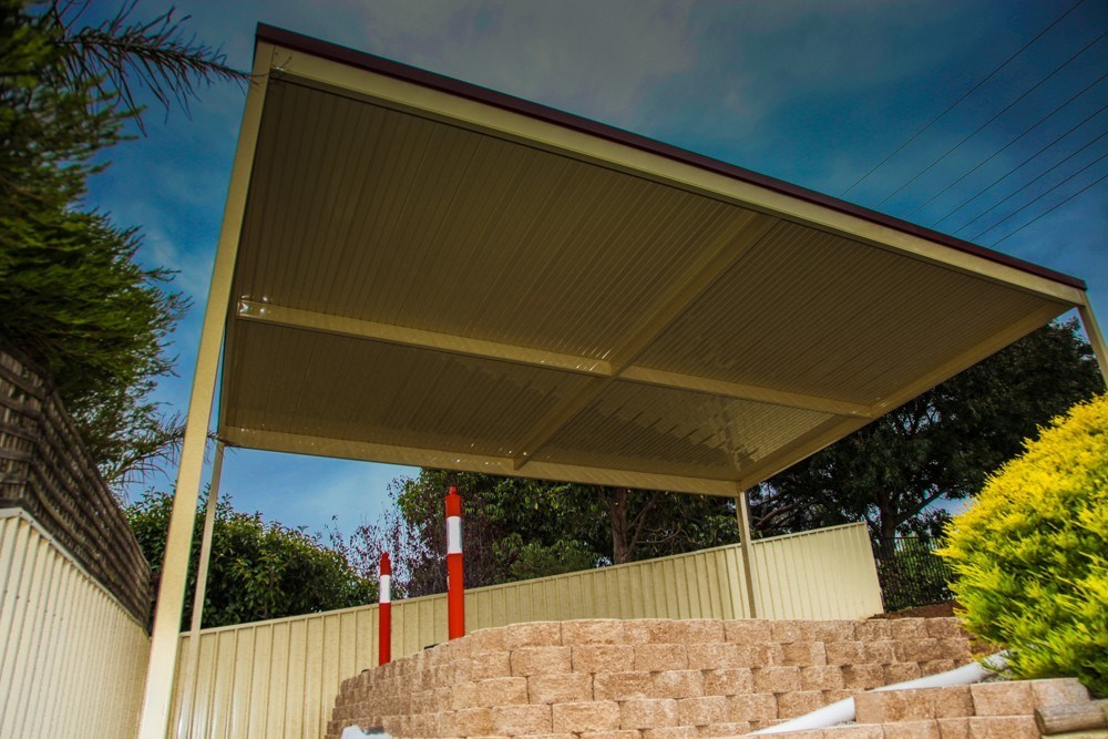 This beautifully designed Colorbond verandah showcases a modern outdoor space with fibreglass roofing, perfect for enhancing any home. A great example of home improvements by expert builders, providing a durable and stylish patio area.