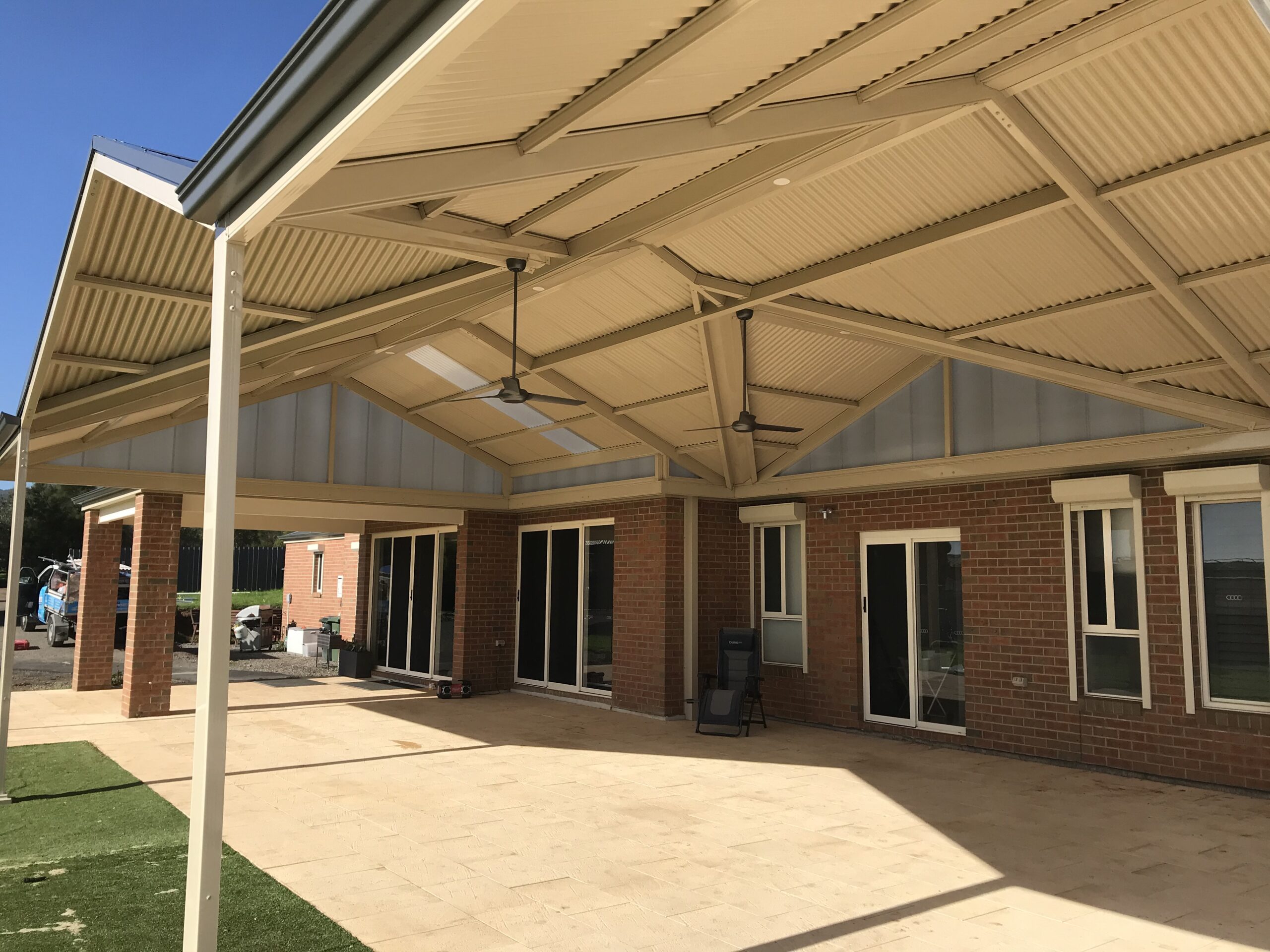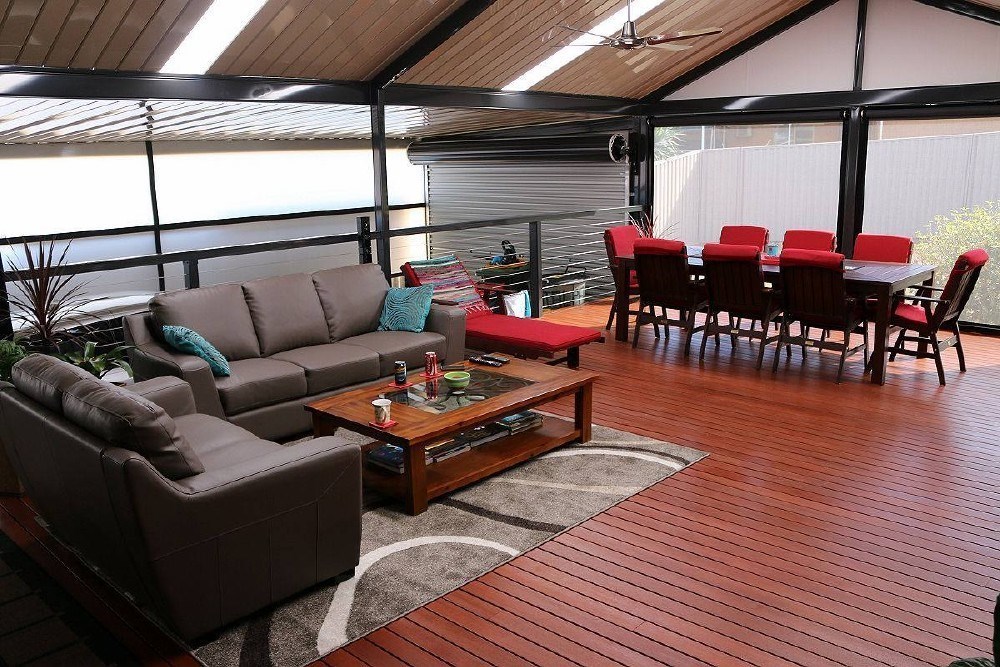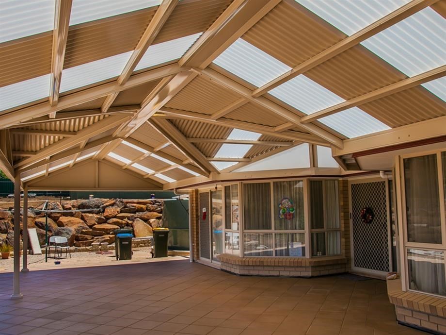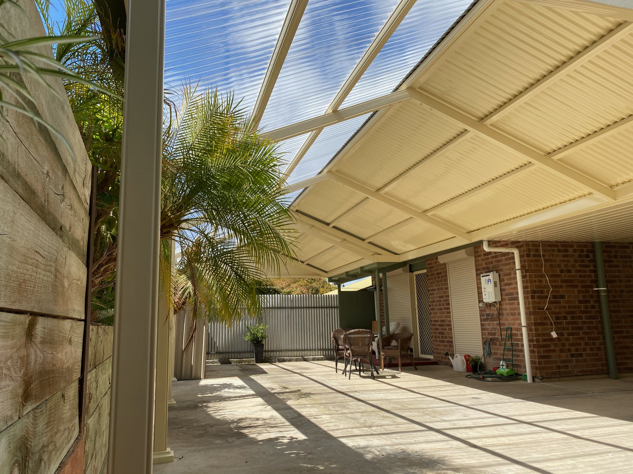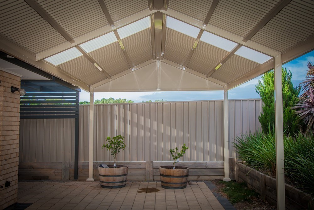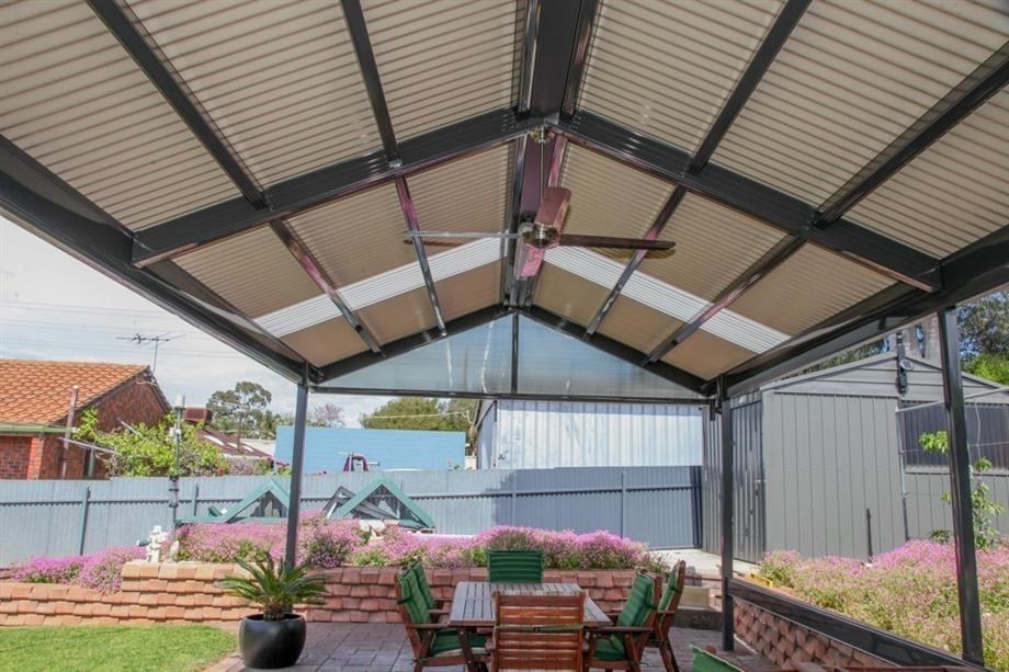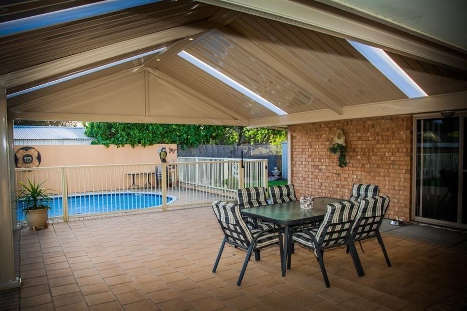 This elegant Colorbond verandah, featuring a durable Fibreglass roof, enhances the outdoor space with its modern design. Ideal for patios, it reflects top-notch home improvement with Bluescope materials and professional builder craftsmanship.