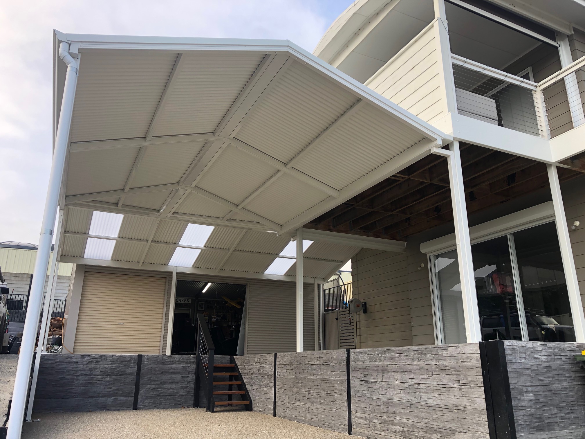 This stunning verandah showcases a modern design with Colorbond roofing and fibreglass elements, creating a perfect outdoor space for relaxation and entertaining. Ideal for home improvements, it complements the home's architecture beautifully.