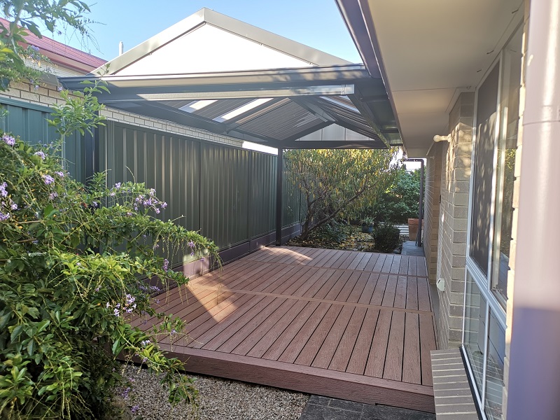 A beautifully designed reverse pitch skillion verandah with a Colorbond roof, enhancing the outdoor patio area in Seaford. This home improvement project, using Bluescope materials, showcases the quality craftsmanship of expert builders.